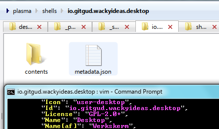 This works (and this is how AeroThemePlasma did it for the longest time), but the drawbacks are obvious. The first drawback is that these changes are purely local and work only for the user that has the modified shell, and the second drawback is that this prevents the user from accessing the default desktop shell if they wish to do so. The user would have to move or rename the directory of the modified shell in order to go back to the original desktop shell. To make these modified changes independently from the default shell, it has to be renamed to something else: