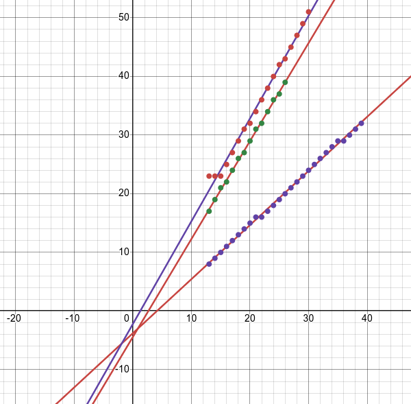 With a bunch of sampled points like this, we want to construct some kind of function that best matches the measured behavior. This is often done using linear regression, and luckily for us, Desmos can easily generate a linear function for a set of points with this method.